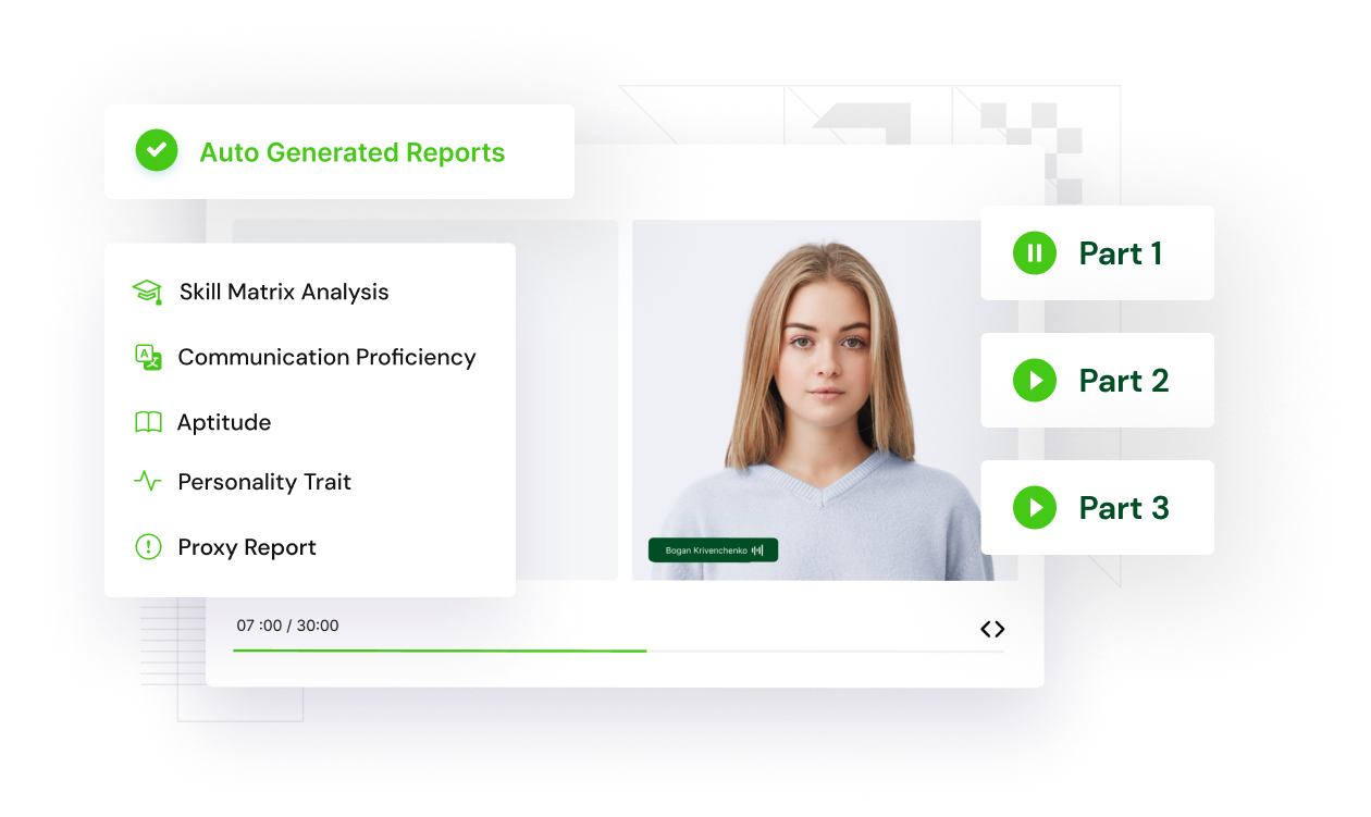 Skill + 3 additional reports, Video recording of interview, screenshots in case of any breaches of conduct